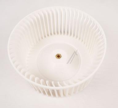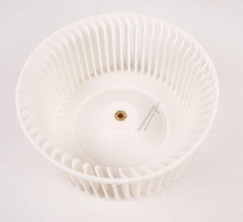 Rodete motor derecho Teka para campanas de extracción. Corresponde al modelo indicado CNL/C601/GF (SAT). Es un rotor de ventilador con aspas radiales y orificio central para su montaje. Fabricado en plástico blanco.