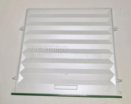 Estante interior de vidrio que hace de tapa del cajón de frutas y verduras.