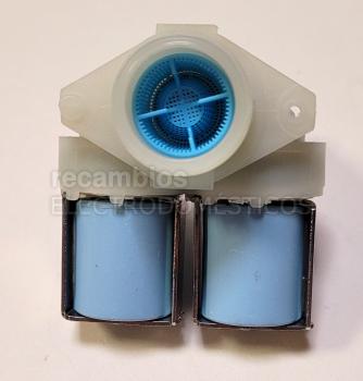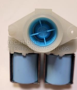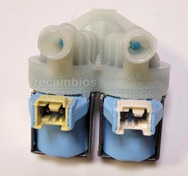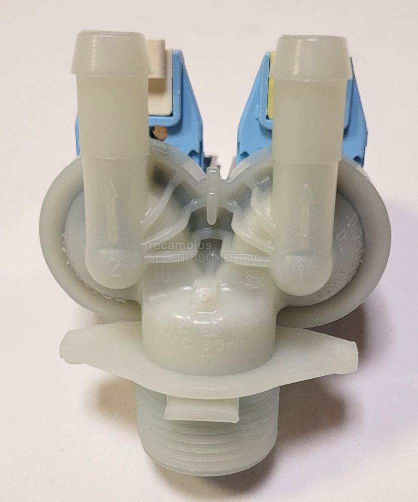 Electroválvula doble vía para lavadora, concebida para gestionar el paso de agua en el ciclo de lavado y controlar su entrada de forma adecuada.