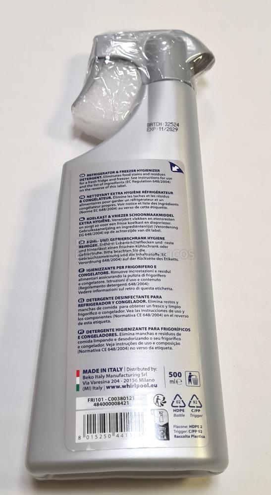 Práctico spray detergente hygienizante para frigoríficos y congeladores. Esta solución de limpieza especializada ayuda a mantener un ambiente higiénico y fresco en tus electrodomésticos de almacenamiento de alimentos. Su cómodo formato en spray facilita su aplicación y garantiza una limpieza efectiva para una mayor tranquilidad.