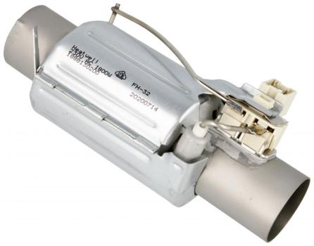 Resistencia tubular para lavavajillas, utilizada como calentador de agua de 1800W a 230V. Tiene un diseño alargado con cuerpo cilíndrico metálico en acabado gris plateado y terminales eléctricos situados en uno de los extremos para su instalación en el aparato. Cuenta con un diámetro exterior de 32 mm y medidas aproximadas de 145 mm de largo, 65 mm de ancho y 60 mm de alto. Incorpora termostato integrado.