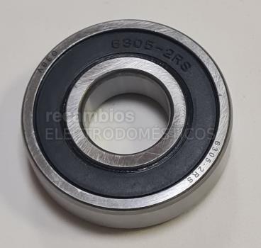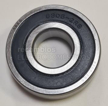 Cojinete de bolas 6305LLU para tambor de aparatos de lavado y secado. Diseño sellado y resistente al agua. Medidas: diámetro interior de 25 mm, diámetro exterior de 62 mm y altura de 17 mm. Pieza circular con anillo interior y exterior, indicada para aplicaciones en conjunto de cuba y tambor.
