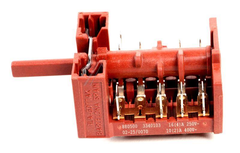 Conmutador para horno, trabaja con corriente AC. Dispone de conector AMP Faston de 6,3 mm, sistema de fijación por tornillo y eje cilíndrico de 6 mm de diámetro con una longitud de 23 mm. No incluye iluminación y está pensado como mando de control para hornos.